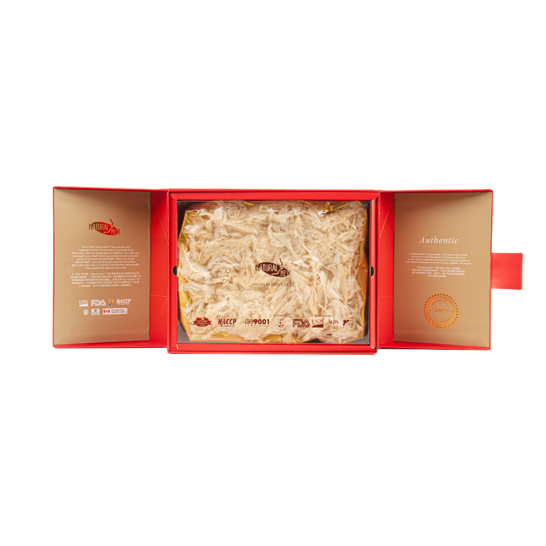白燕窝以其精致的口感而闻名,位列全球中华美食五强,是市场上最受欢迎的燕窝。它是首次购买者和忠实客户的理想选择,每年收获四次。它富含蛋白质和维生素,通过增强内部液体和滋养肺部而有益于所有年龄段。它的质地比红燕和橙燕更柔软、更轻。